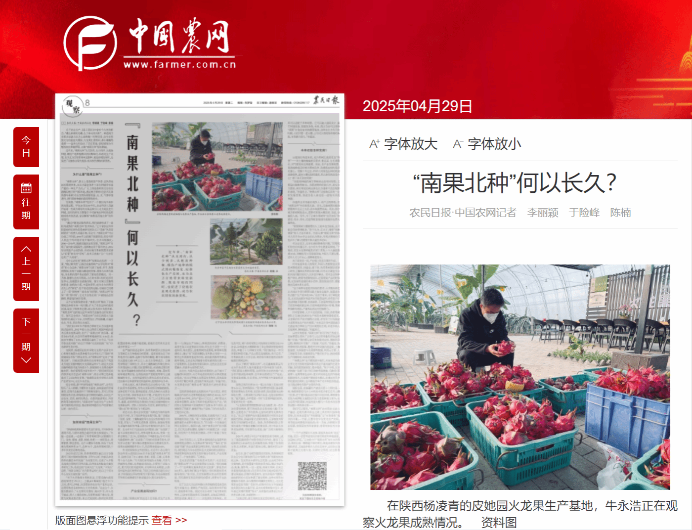 在陕西,杨凌职业技术学院火龙果产业研发中心和青皮她园火龙果种植专业合作社(以下简称青皮她园合作社)联合攻关,由南果北种走向了南果北育。目前该团队拥有自主培育的适合于我国北方地区设施种植的火龙果新品种2个,制定火龙果设施种植技术地方标准5个,获批授权火龙果设施种植水肥一体化管理等方面专利7个。我们陕西民间有很多高手在尝试南果北种,部分水果已经种植成功了,比如青皮甘蔗。杨凌职业技术学院火龙果产业研发中心主任牛永浩说。