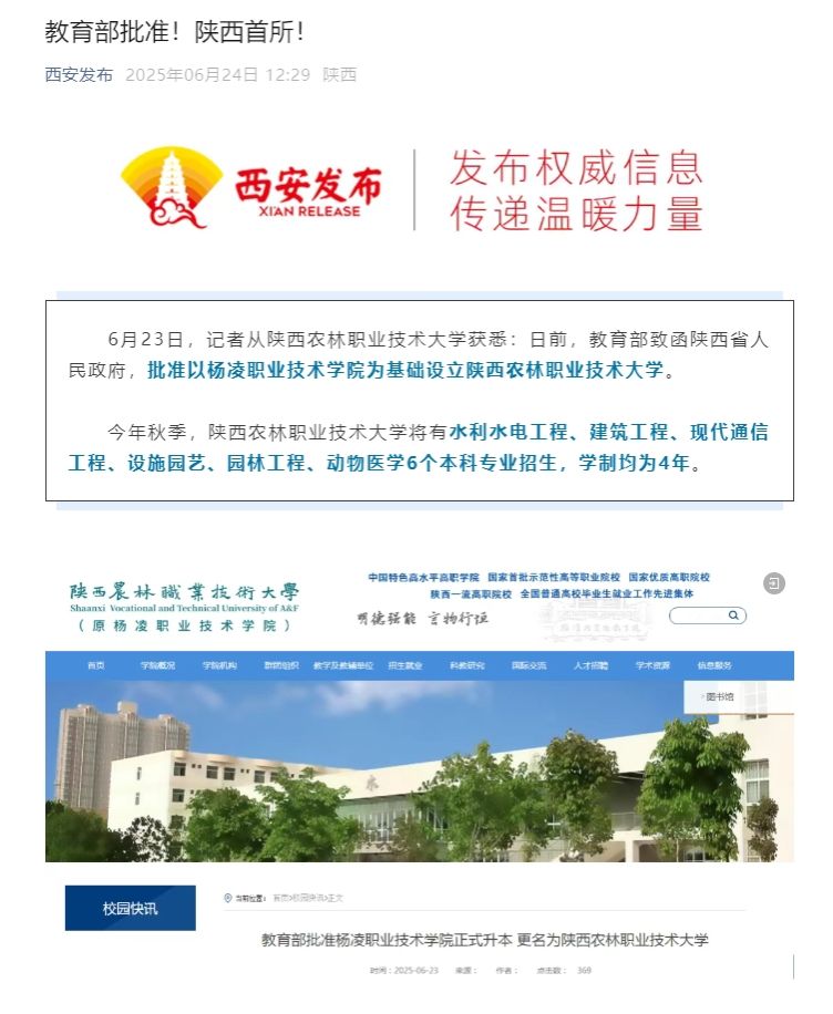 6月23日,记者从陕西农林职业技术大学获悉:日前,教育部致函陕西省人民政府,批准以杨凌职业技术学院为基础设立陕西农林职业技术大学。