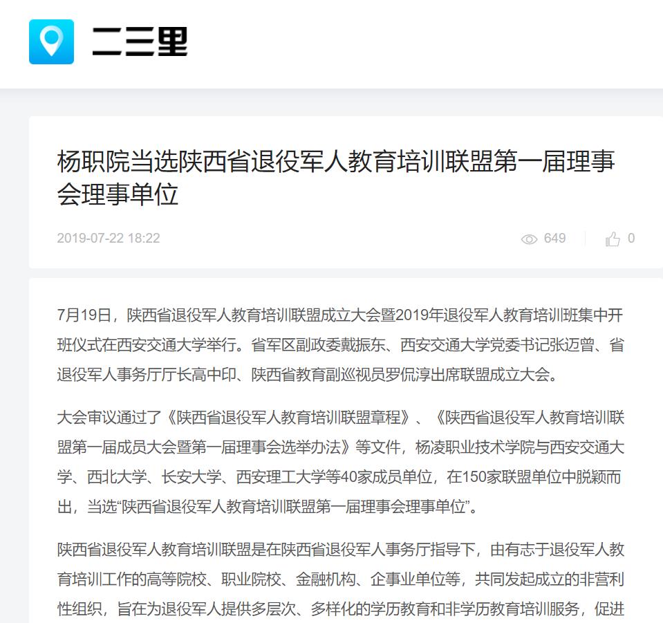 大会审议通过了《陕西省退役军人教育培训联盟章程》、《陕西省退役军人教育培训联盟第一届成员大会暨第一届理事会选举办法》等文件,杨凌职业技术学院与西安交通大学、西北大学、长安大学、西安理工大学等40家成员单位,在150家联盟单位中脱颖而出,当选“陕西省退役军人教育培训联盟第一届理事会理事单位”。
