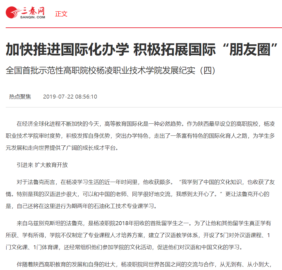 在经济全球化进程不断加快的今天,高等教育国际化是一种必然趋势。作为陕西最早设立的高职院校,杨凌职业技术学院审时度势,积极发挥自身优势,突出办学特色,走出了一条富有特色的国际化育人之路,为学生多元发展和走向世界提供了广阔的成长成才平台。