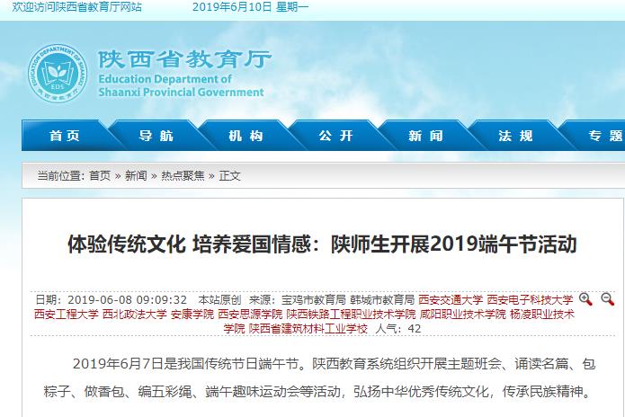 2019年6月7日是我国传统节日端午节。陕西教育系统组织开展主题班会、诵读名篇、包粽子、做香包、编五彩绳、端午趣味运动会等活动,弘扬中华优秀传统文化,传承民族精神。