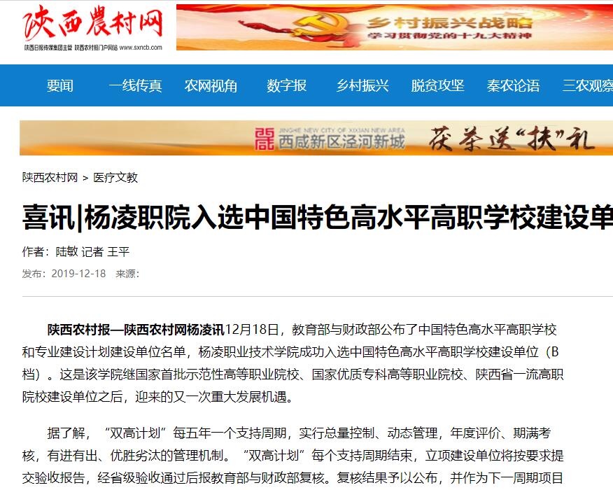 【陕西农村网】喜讯|杨凌职院入选中国特色高水平高职学校建设单位
