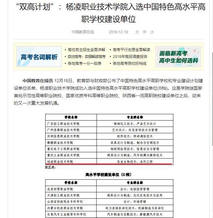 【中国教育在线】“双高计划”:杨凌职业技术学院入选中国特色高水平高职学校建设单位