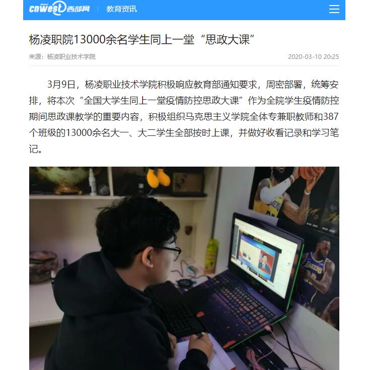3月9日,杨凌职业技术学院积极响应教育部通知要求,周密部署,统筹安排,将本次“全国大学生同上一堂疫情防控思政大课”作为全院学生疫情防控期间思政课教学的重要内容,积极组织马克思主义学院全体专兼职教师和387个班级的13000余名大一、大二学生全部按时上课,并做好收看记录和学习笔记。
