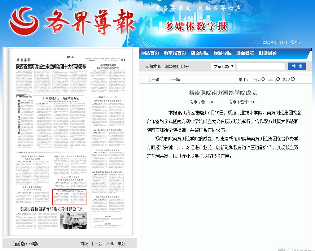 杨凌职院南方测绘学院的成立,标志着杨凌职院与南方测绘集团在合作办学方面迈出关键一步,对促进产业链、创新链和教育链“三链融合”,实现校企双方互利共赢,推进行业发展将发挥积极作用。