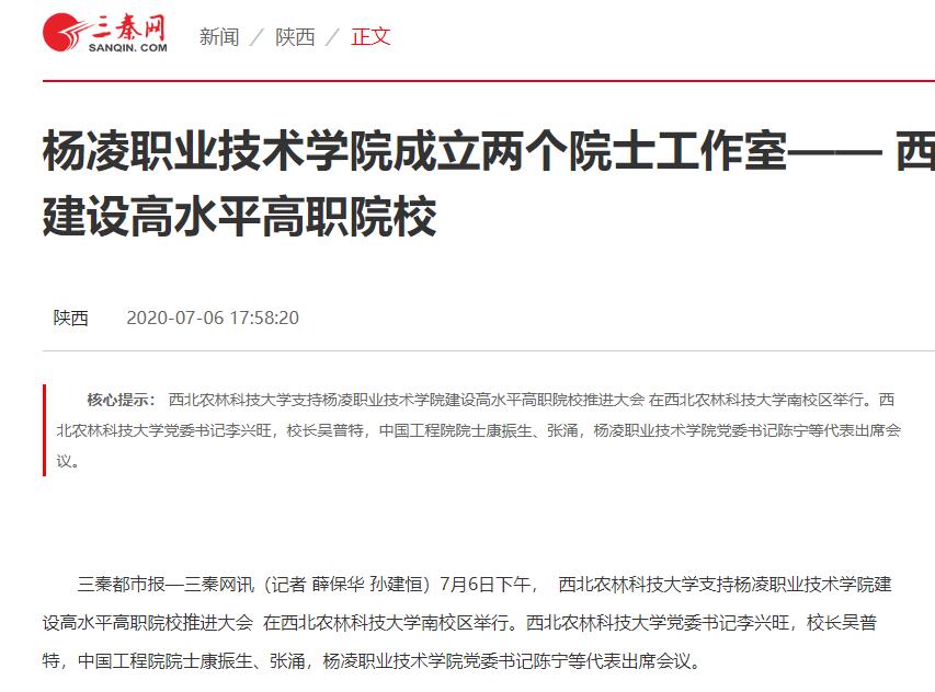 【三秦网】杨凌职业技术学院成立两个院士工作室—— 西农大支持杨职院 建设高水平高职院校