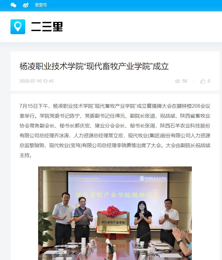 7月15日下午,杨凌职业技术学院“现代畜牧产业学院”成立暨揭牌大会在醒钟楼208会议室举行。学院党委书记陈宁、党委副书记任得元、副院长张迪、祝战斌,陕西省畜牧业协会常务副会长、秘书长郭庆宏、猪业分会会长、秘书长张周,陕西石羊农业科技股份有限公司总经理乔冰涛、人力资源总经理常立宏,现代牧业(集团)股份有限公司人力资源总监黎骏驹,现代牧业(宝鸡)有限公司总经理李骁勇等出席了大会。大会由副院长祝战斌主持。