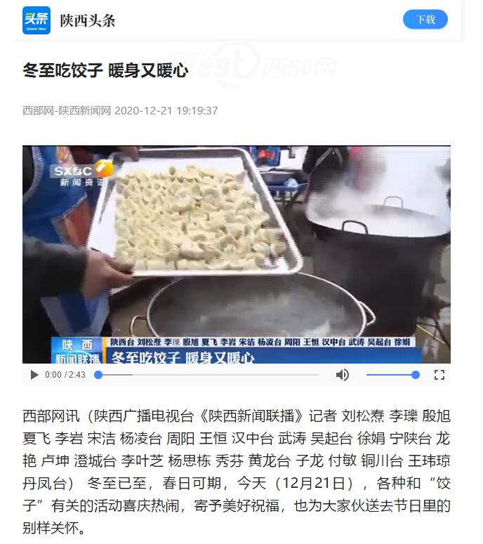 (陕西广播电视台《陕西新闻联播》记者 刘松焘 李瓅 殷旭 夏飞 李岩 宋洁 杨凌台 周阳 王恒 汉中台 武涛 吴起台 徐娟 宁陕台 龙艳 卢坤 澄城台 李叶芝 杨思栋 秀芬 黄龙台 子龙 付敏 铜川台 王玮琼 丹凤台) 冬至已至,春日可期,今天(12月21日),各种和“饺子”有关的活动喜庆热闹,寄予美好祝福,也为大家伙送去节日里的别样关怀。