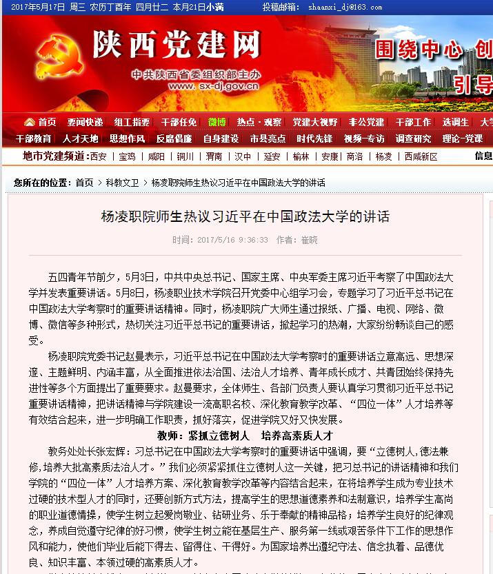 五四青年节前夕,5月3日,中共中央总书记、国家主席、中央军委主席习近平考察了中国政法大学并发表重要讲话。5月8日,杨凌职业技术学院召开党委中心组学习会,专题学习了习近平总书记在中国政法大学考察时的重要讲话精神。同时,杨凌职院广大师生通过报纸、广播、电视、网络、微博、微信等多种形式,热切关注习近平总书记的重要讲话,掀起学习的热潮,大家纷纷畅谈自己的感受。