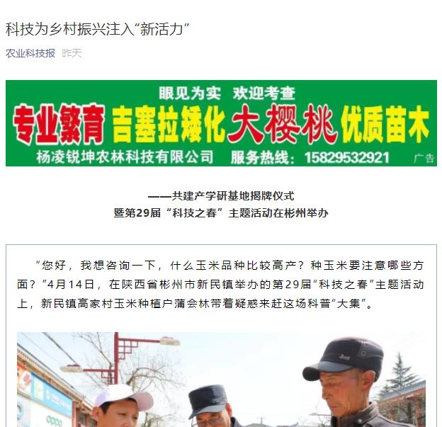 同时,校地双方还通过示范推广农业高新技术,全面提升彬州市农村主导产业的科技含量,实现农业经济跨越式的发展,充分整合资源,做实做好科技创新、科研推广、成果转化,将彬州基地建成全省、甚至西北地区乡村振兴示范基地的优秀典范和样板,努力为实现农民增收和当地经济社会发展贡献杨职智慧和杨职力量。