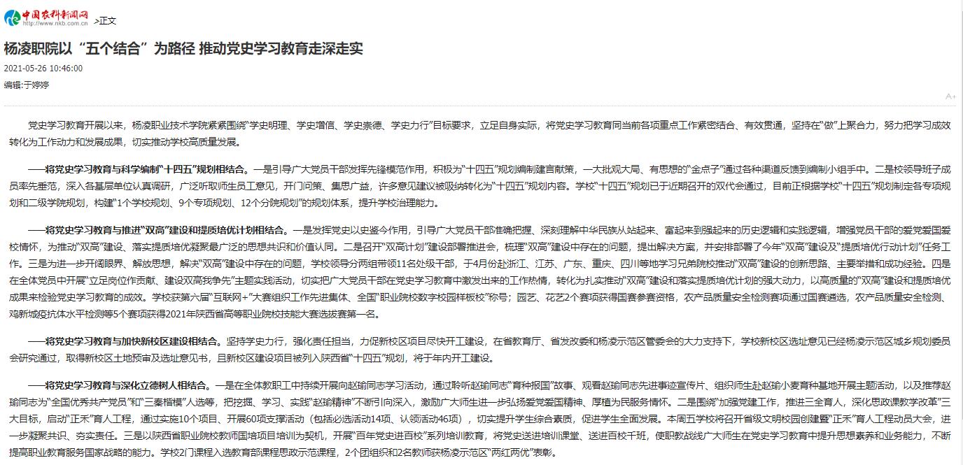 【中国农科新闻网】杨凌职院以“五个结合”为路径 推动党史学习教育走深走实