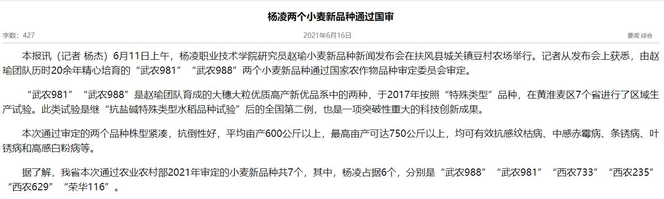 据了解,我省本次通过农业农村部2021年审定的小麦新品种共7个,其中,杨凌占据6个,分别是“武农988”“武农981”“西农733”“西农235”“西农629”“荣华116”。