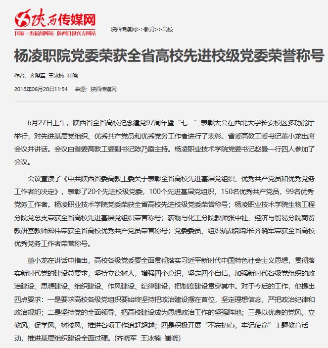 【陕西传媒网】杨凌职院党委荣获全省高校先进校级党委荣誉称号