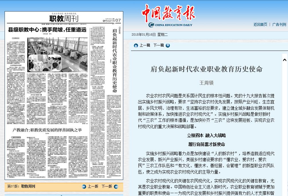 1月16《中国教育报》7版刊发了我院院长王周锁署名文章《肩负起新时代农业职业教育历史使命》全文刊载如下(详情进入):