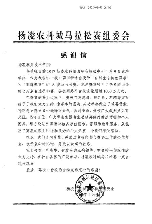 杨凌农科城马拉松赛组委会感谢信