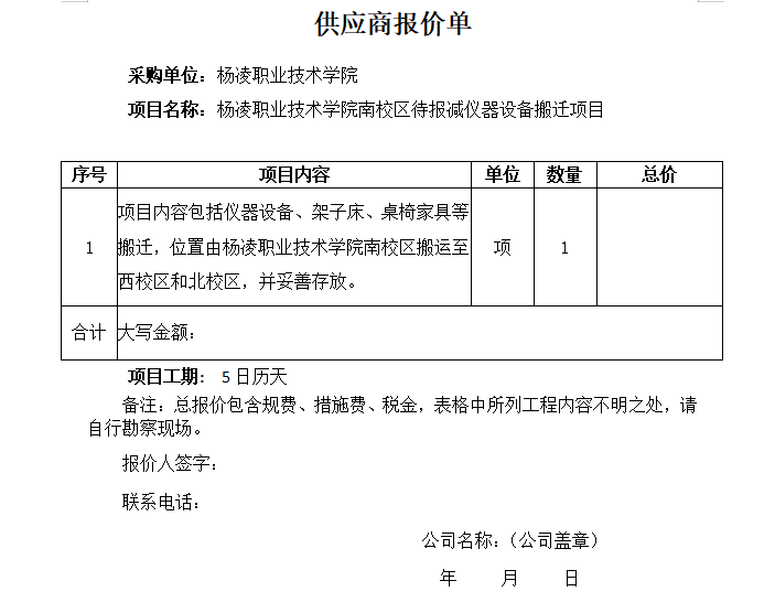 附:1. 杨凌职业技术学院南校区待报减仪器设备搬迁项目报价单。