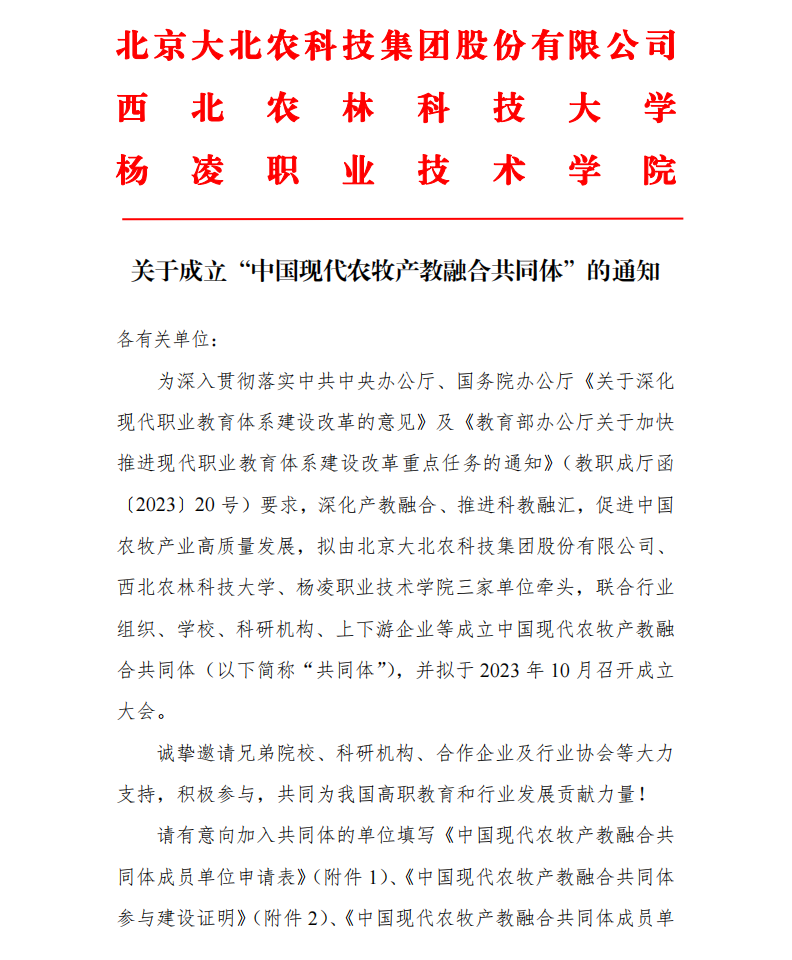 北京大北农科技集团股份有限公司 西北农林科技大学 杨凌职业技术学院关于成立“中国现代农牧产教融合共同体”的通知