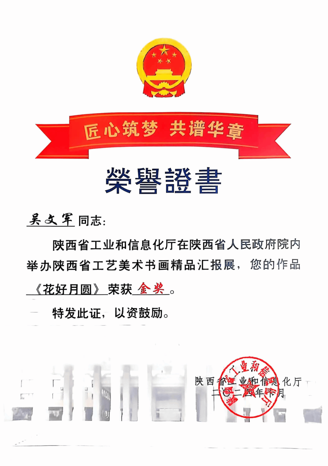 2017年,吴文军回到杨凌职业技术学院任教,事业也自此步入蓬勃发展的新阶段。同年,作品《百鸟朝凤》荣获“金凤凰”大奖赛银奖。2018年,作品《鸟语花香》斩获“金凤凰”大奖赛金奖。2019年,被评为陕西省工艺美术大师。