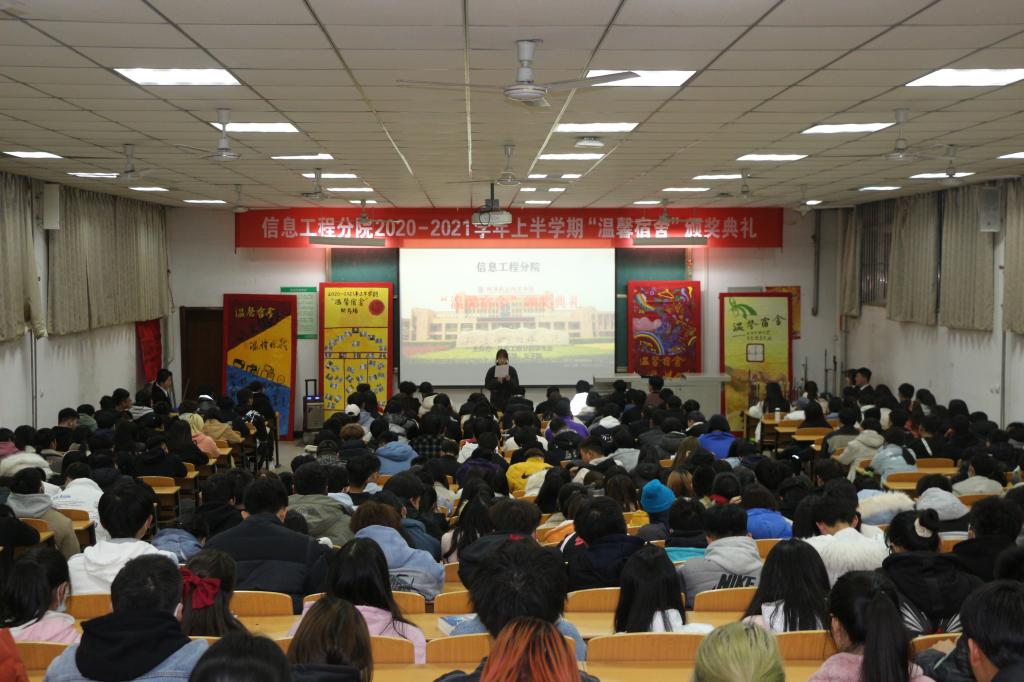为深入推进“三全育人”方针,压实 “四位一体”人才培养,落实“纪律卫生安全教育月”活动方案,信息工程分院于2020年12月23日在NOB107举办了2020—2021学年第一学期“温馨宿舍”颁奖典礼。本次活动由分院学生会生活部和女子部联合举办,270余名宿舍代表参加。