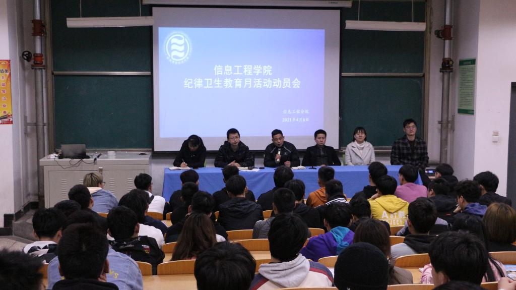 为了强化学生卫生纪律意识,增强学生自律守纪能力,促进学生良好行为习惯养成,进一步优化宿舍环境,着力构建优良校风学风,提升学生的教育管理效果,信息工程学院于4月6日18:30在醒钟楼201举行了“纪律卫生教育月活动”动员会。