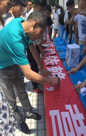 信息工程分院党总支书记高掌平老师、分院办公室主任弓有辉老师也莅临现场勉励同学,高掌平老师在横幅上签下“放下手机,海阔天空”,希望同学们能够在青春年华展示自己,放飞自己,不在方寸屏幕中旁观而在宽广世界里体验。