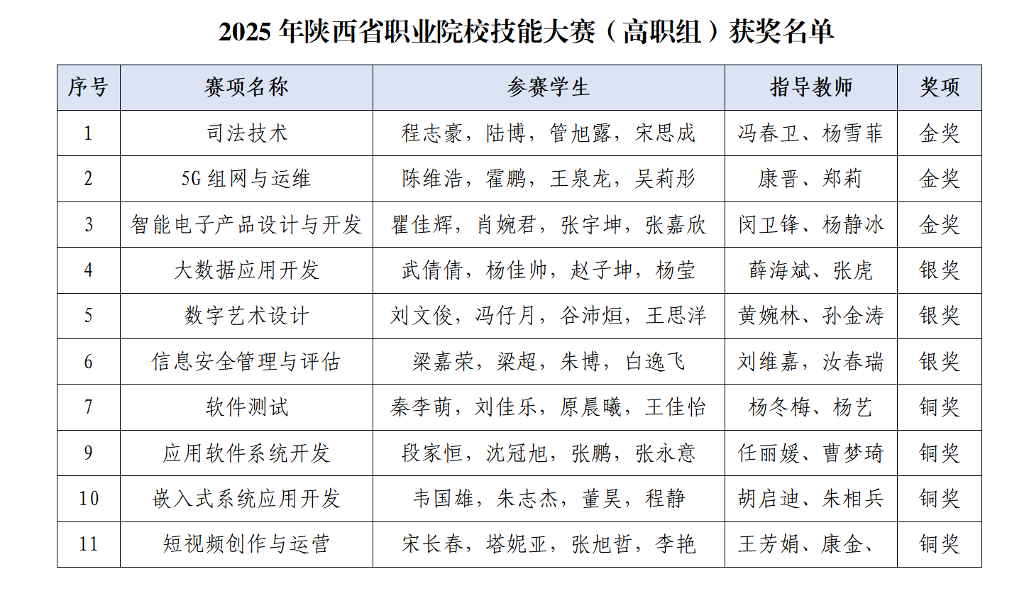 在陕西省职业院校技能大赛中,我院荣获金奖3项、银奖3项、铜奖4项。
