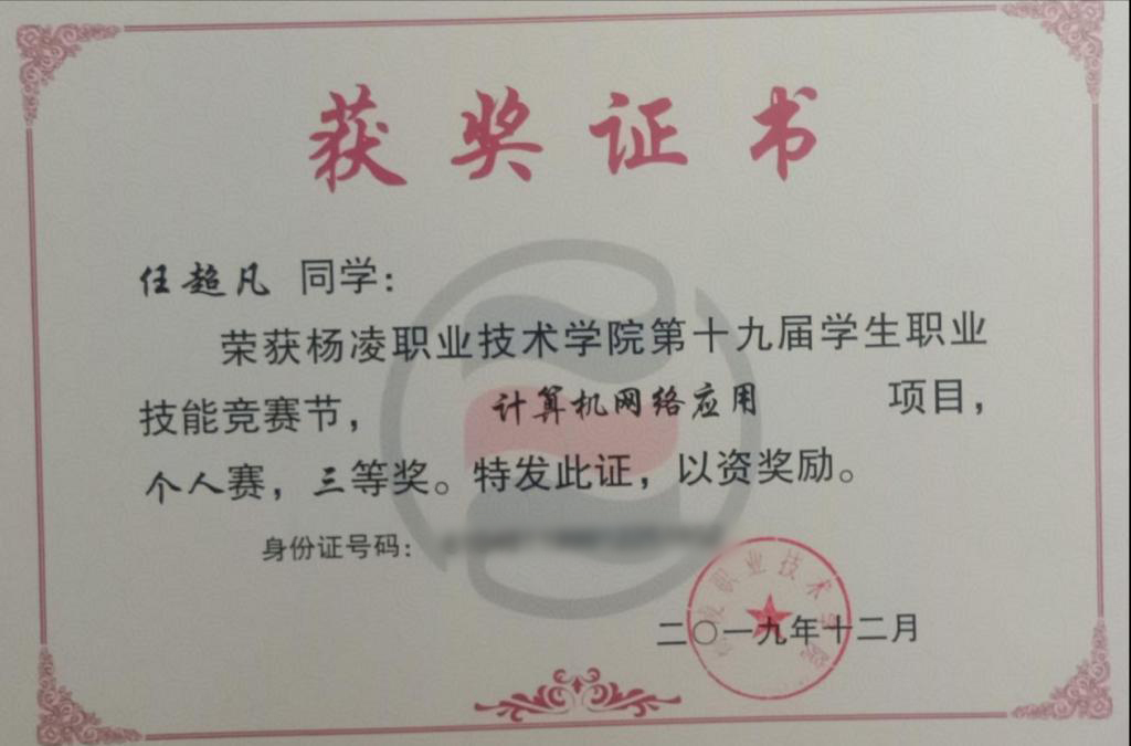 在校情况:在大一的时候参加了羽毛球社团学习和练习了一年。大二报名参加了杨凌职业技术学院第十九届学生职业技能竞赛节,在计算机网络应用项目荣获个人三等奖。回顾这三年大学生涯,参加的活动不多,一有空闲时间我基本上都会泡在图书馆。