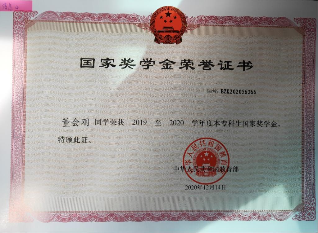 荣获2019-2020学年国家奖学金