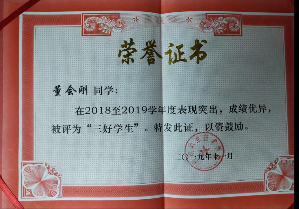 2019年11月荣获杨凌职业技术学院2018-2019学年三好学生