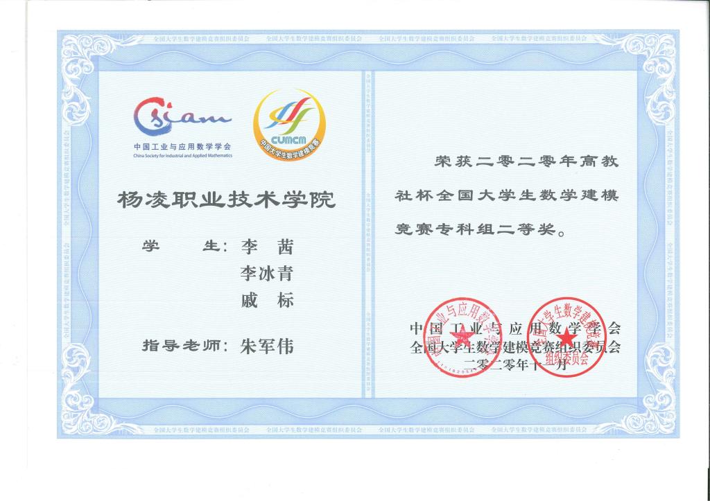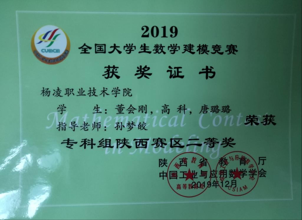 2019年12月荣获全国大学生数学建模竞赛陕西赛区二等奖