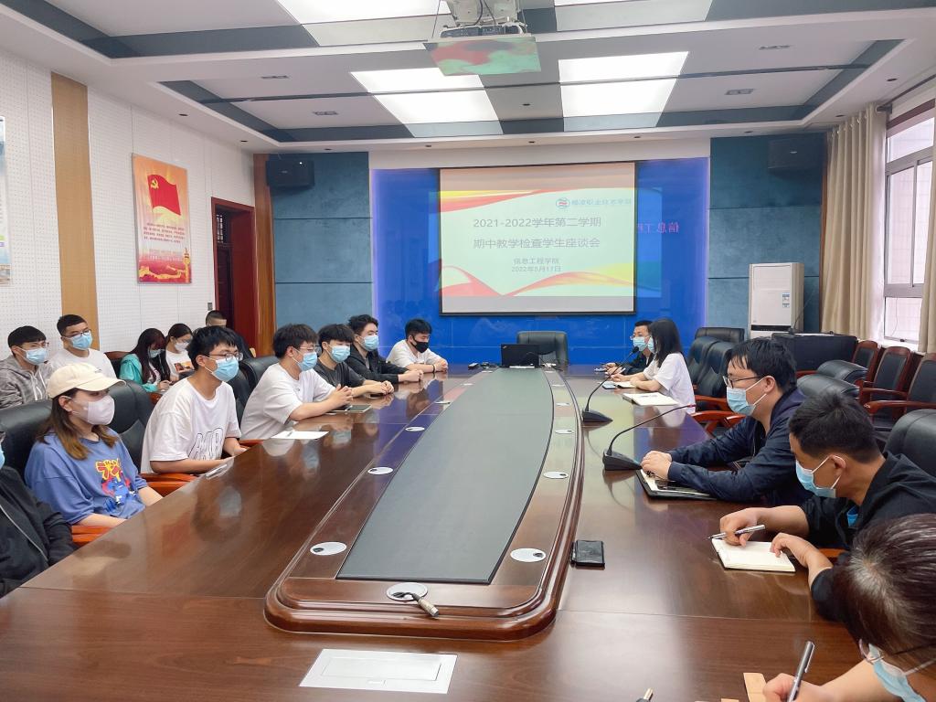 根据学校要求,为深入了解教学运行情况,贴近学生实际,2022年5月17日晚,信息工程学院召开期中教学检查学生座谈会。座谈会分南北校区分别举行,学院2020级、2021级47个班级的学生代表、分院领导、两办工作人员、文理学院教师代表参加了本次座谈会。